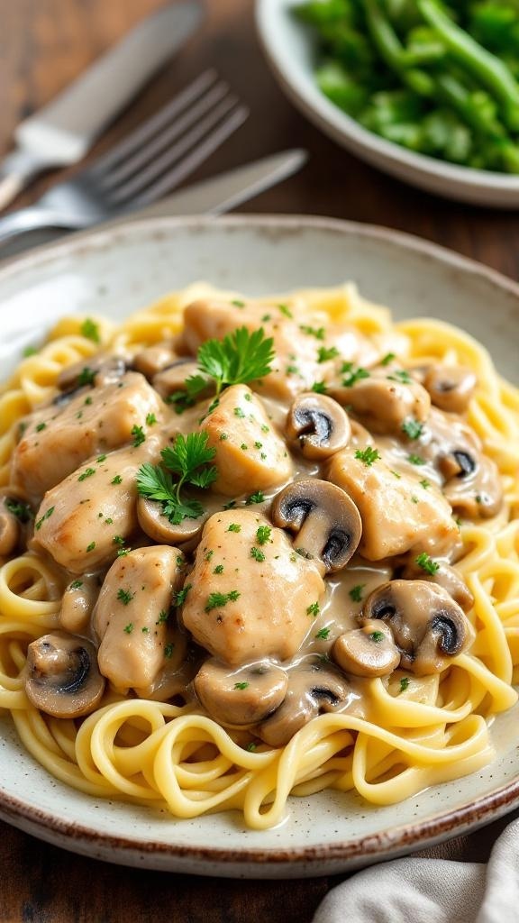 - Serve: Plate the cooked noodles and top with the creamy chicken and mushroom mixture. Garnish with fresh parsley before serving.