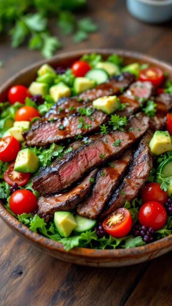 This vibrant steak salad is a delightful blend of fresh ingredients that come together to create a nutritious meal. The combination of mixed greens, cherry tomatoes, cucumber slices, and diced avocado not only adds color but also provides a variety of textures and flavors.