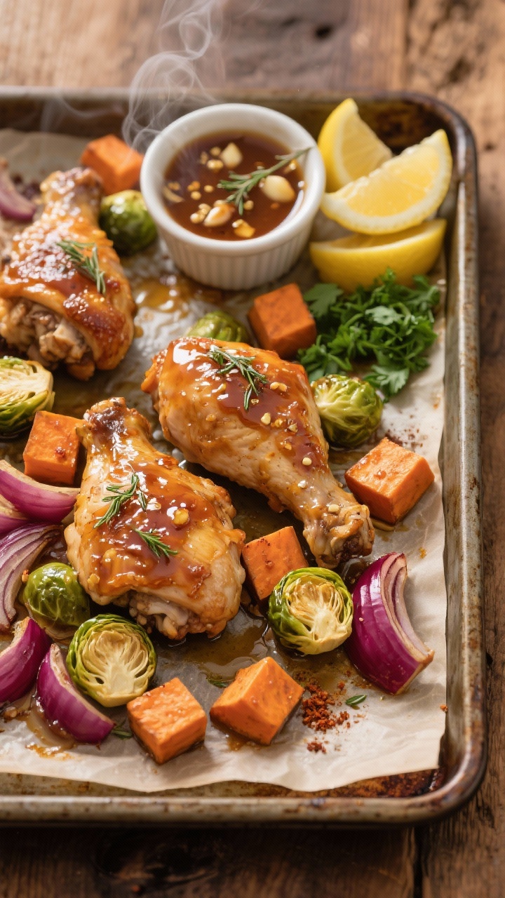 This is the weeknight hero: one pan, big flavor, minimal cleanup. The maple-Dijon glaze turns chicken golden and sticky while sweet potatoes and Brussels sprouts roast to caramelized perfection. It’s family-friendly, meal-prepable, and smells like sweater weather.