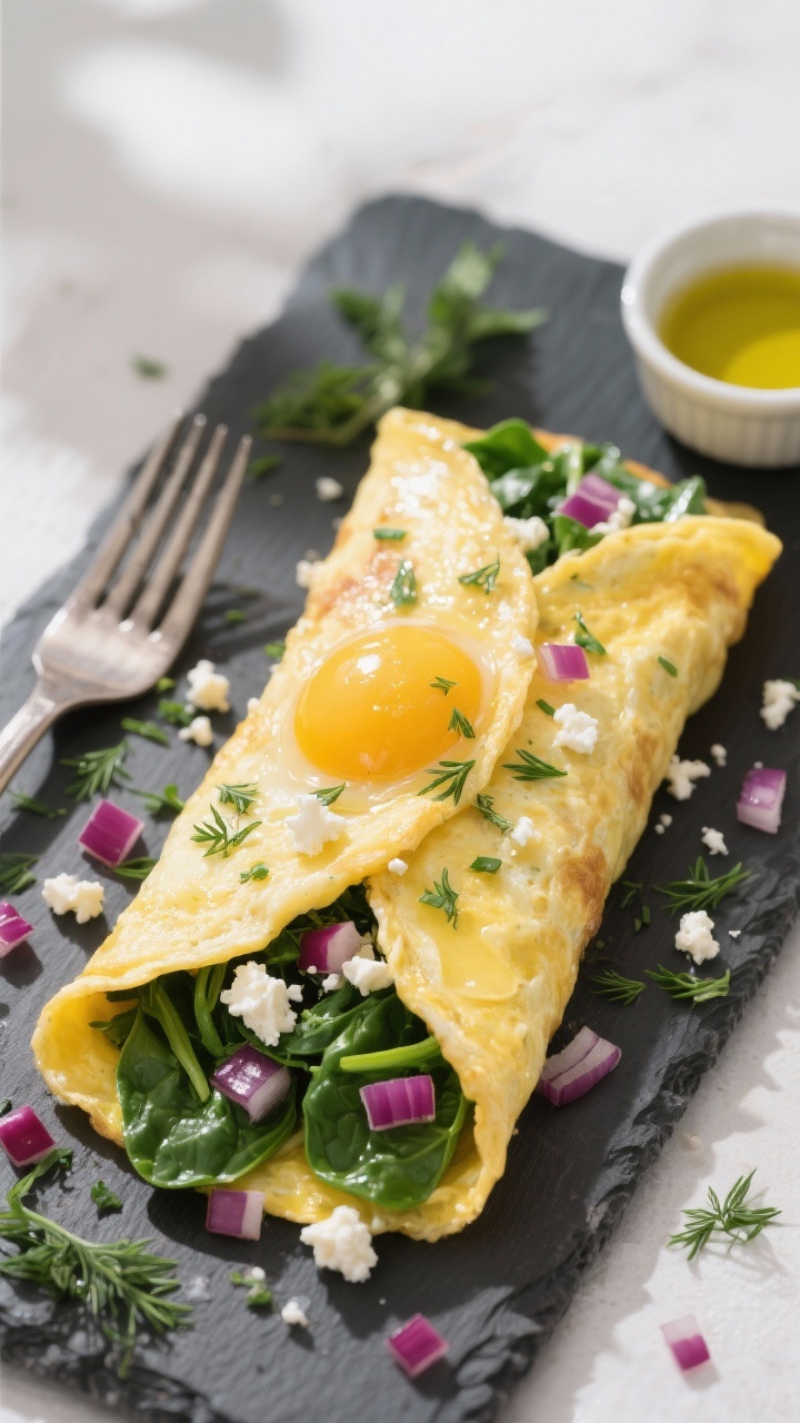 This is the breakfast you make when you want diner-level satisfaction without the nap. It’s a fluffy omelet folded into a handheld wrap with greens and tangy feta—portable, hearty, and super customizable. Great for busy mornings or after a workout.